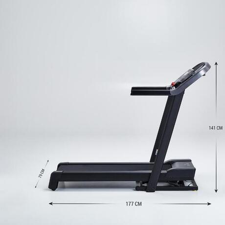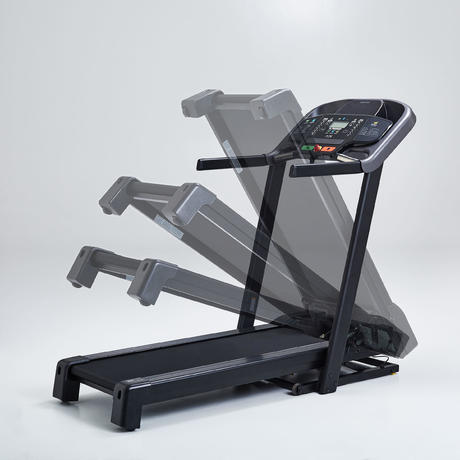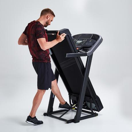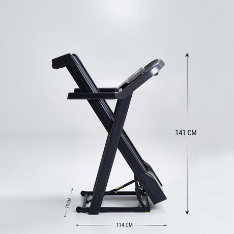 A T540 futópad összecsukható, így használaton kívül kevesebb helyet foglal. Összecsukva a padlón mindössze 114x79 cm helyet foglal.