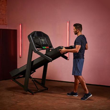 A T900 futópad összecsukható, így használaton kívül kevesebb helyet foglal. Összecsukva a padlón mindössze 133x88 cm helyet foglal.