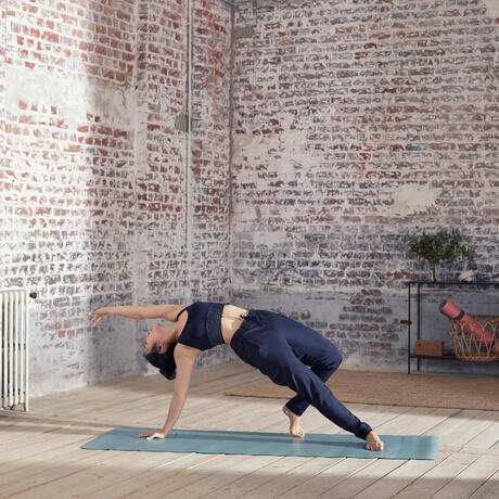 Ez a nadrág maximális mozgásszabadságot biztosít dinamikus jóga közben. Bő szabású és légáteresztő, követi minden mozdulatodat. Elég vastag a szövet, hogy ne látsszék át, magas a dereka: magabiztosan végezheted az ászanákat. Állítható száraljának köszönhetően fejjel lefelé sem mozdul el. 2 zsebbel és szorítózsinórral a derékban.